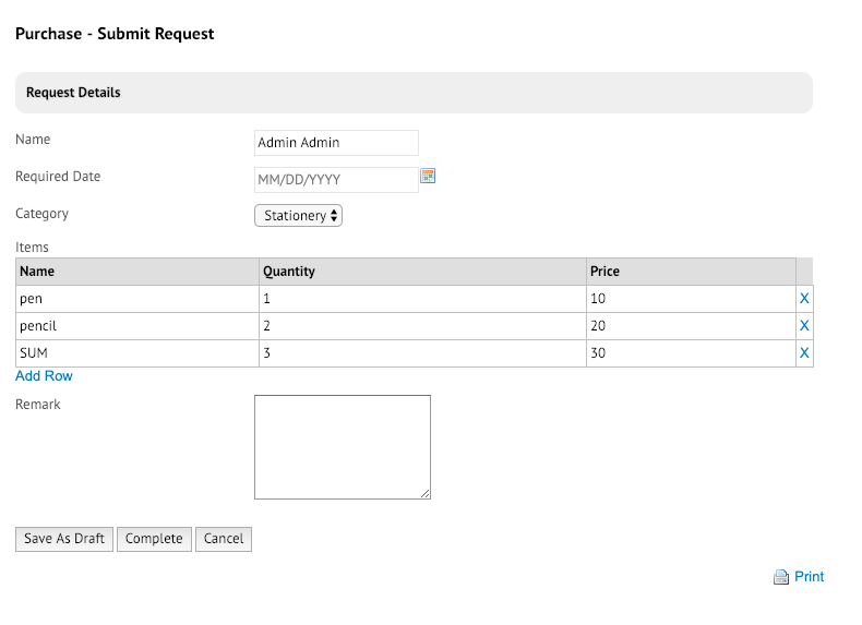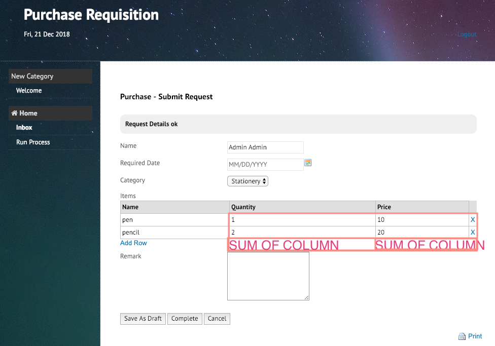 +--------+------------+---------+---------------------------------+ | c_name | c_quantity | c_price | c_parent_id | +--------+------------+---------+---------------------------------+ | pen | 1 | 10 | 1177_purchaseRequition_purchase | | pencil | 2 | 20 | 1177_purchaseRequition_purchase | | SUM | 3 | 30 | 1177_purchaseRequition_purchase | +--------+------------+---------+---------------------------------+