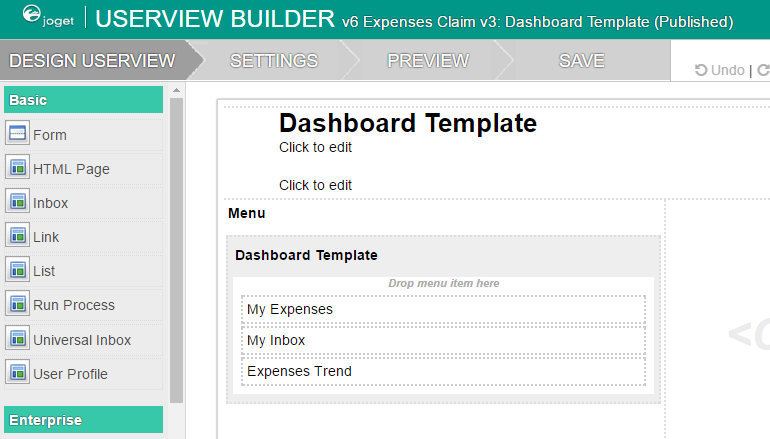 Figure 2: Userview containing menu items meant for the Dashboard userview