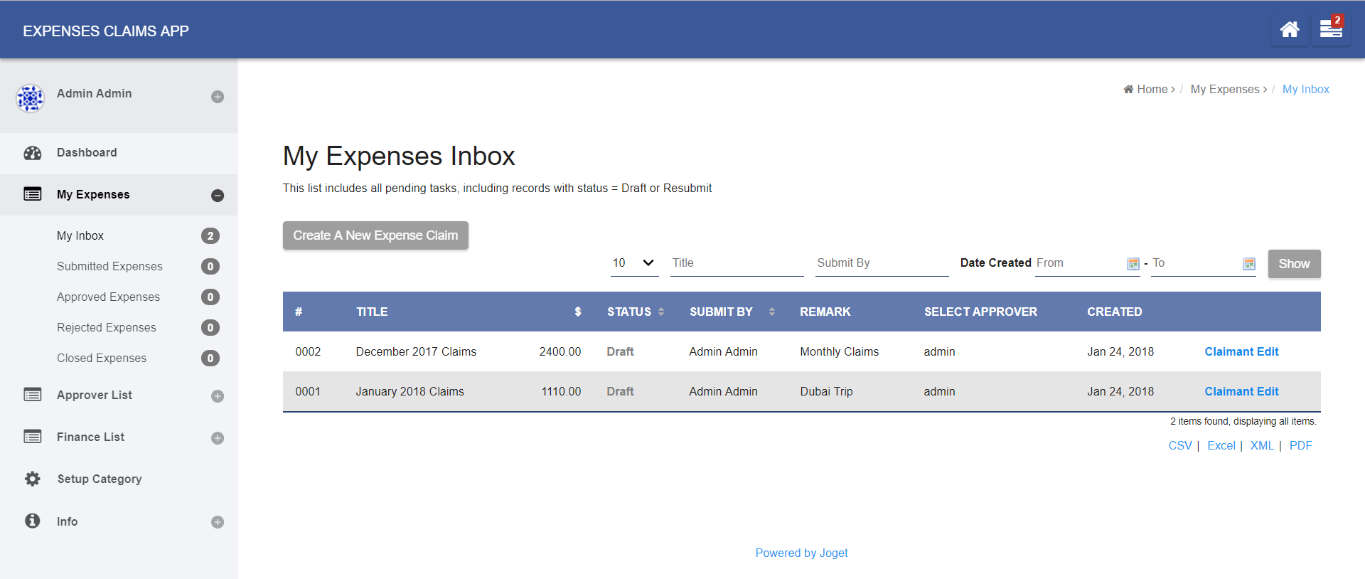 Figure 1: Screenshot showing Datalist Inbox from sample HR Expenses Claim app