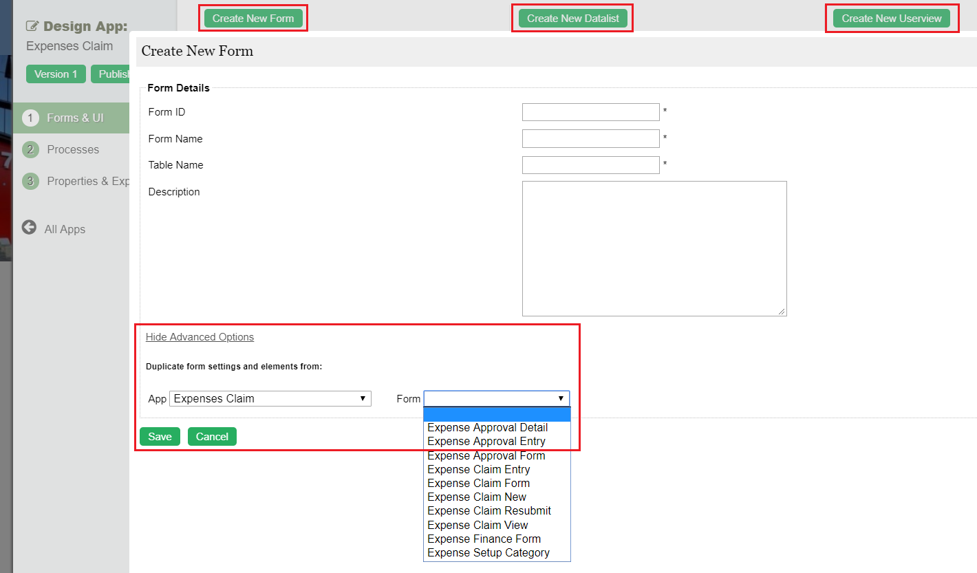 To duplicate a Form, Datalist, or Userview, create a new element, then click on "Advanced Options" and duplicate your elements here.