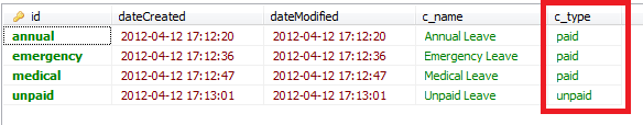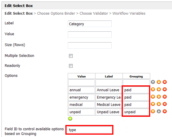 In the example shown below, the "Category" select box is based on the type of leave designated in the Type of Leave field.