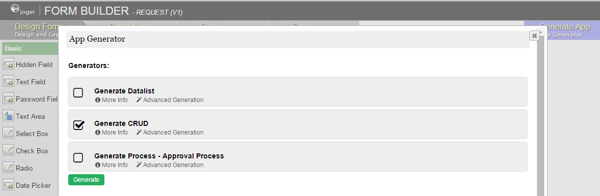 Figure 3: Screenshot showing Generate CRUD plugin in Generate App function
