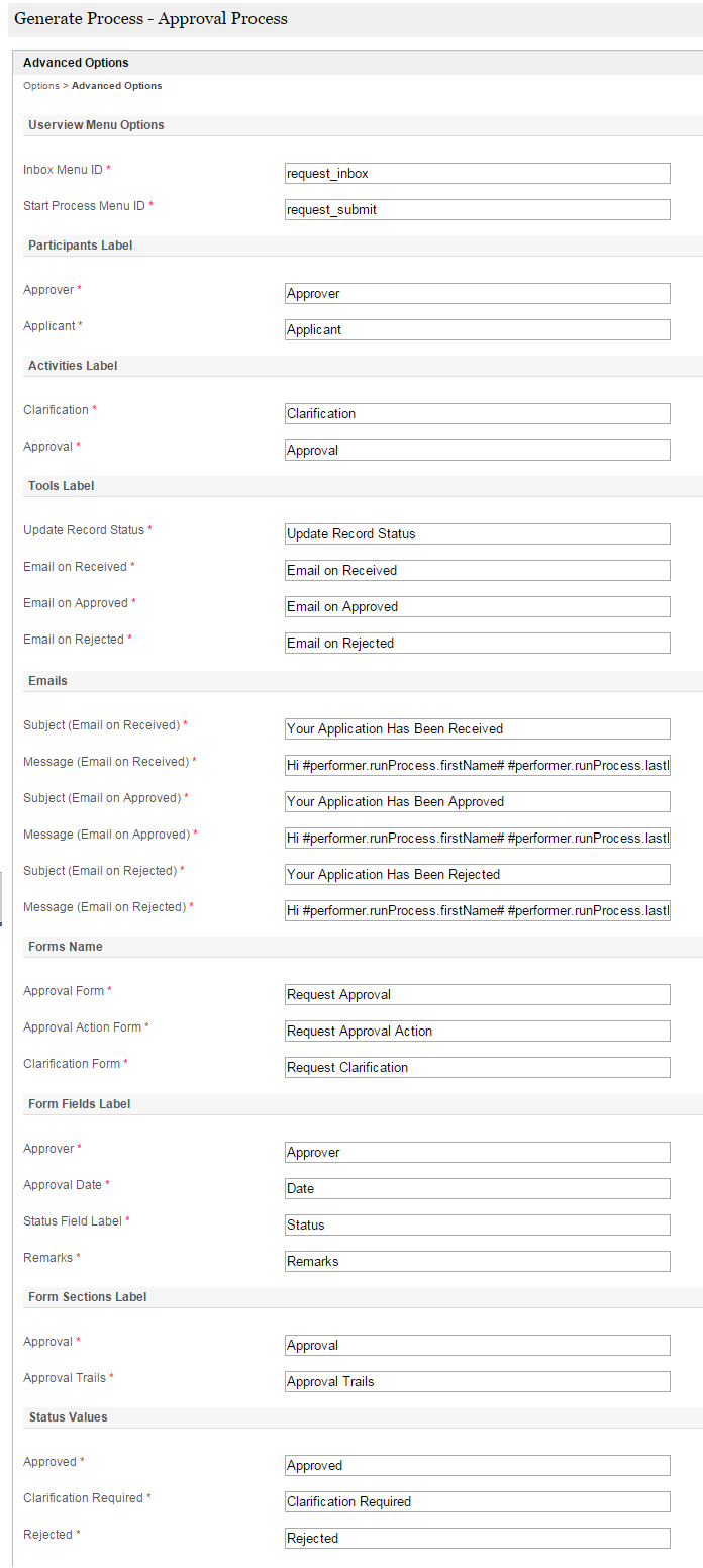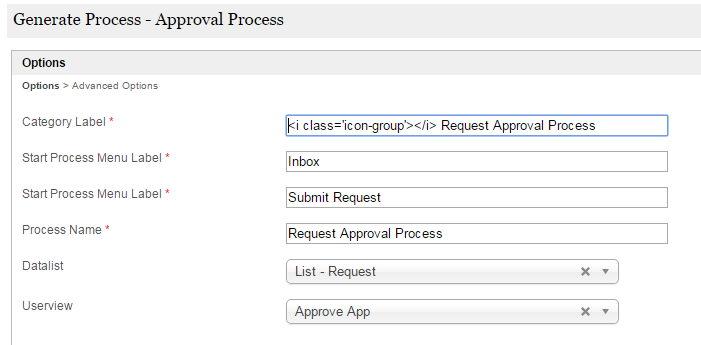Generate Process - Approval Process function will generate a generic approval process flow together with complementing forms and userview menu item into your existing app from a form.