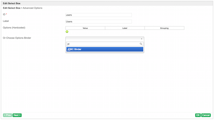 To develop a JDBC Options binder, we will need the JDBC connection setting and also the custom query to populate the options.