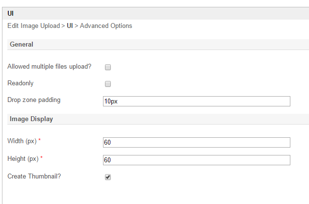 Create Thumbnail? | Determines if the element will create a thumbnail and show it below the upload file element after image is uploaded. |