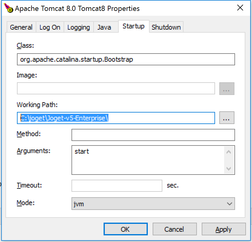 - Go to startup tab, set the working path to your Joget Workflow's installation folder. Repeat it for shutdown tab too.