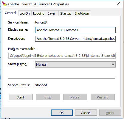 Command PromptC:\joget\Joget-v5-Enterprise\apache-tomcat-8.0.33\bin>service.bat install Installing the service 'Tomcat8' ... Using CATALINA_HOME: "C:\joget\Joget-v5-Enterprise\apache-tomcat-8.0.33" Using CATALINA_BASE: "C:\joget\Joget-v5-Enterprise\apache-tomcat-8.0.33" Using JAVA_HOME: "C:\Program Files\Java\jdk1.7.0_79" Using JRE_HOME: "C:\Program Files\Java\jdk1.7.0_79\jre" Using JVM: "C:\Program Files\Java\jdk1.7.0_79\jre\bin\server\jvm.dll" The service 'Tomcat8' has been installed.