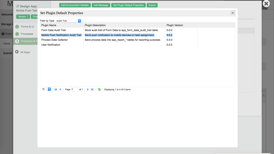 3. In the Design App page of the Joget Workflow app that you would like to send push notifications, click on the Set Plugin Default Properties button, and select the Mobile Push Notification Audit Trail plugin.