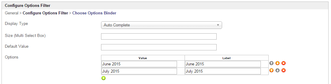| Options | Options to be made available for filter search. Foreign key If your column stores the foreign key to another form table, you can make use of this Options Filter and set the Options Binder (i.e. Default Form Options BInder) so that you can search by using the label column configured. |