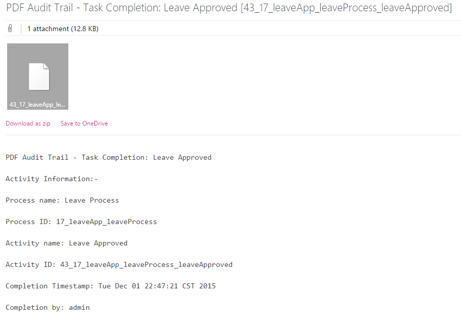 This is an Audit Trail plugin that intercepts assignment completion event. This plugin can be configured to store form with form data in .pdf extension of a completed assignment in the server or/and send out the attachment as email.