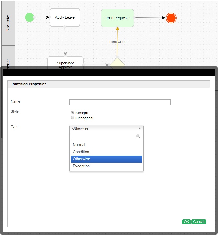 Decisions are used when you want to insert a point in your process where the flow will be determined by a set of rules. For instance, in our Leave Application process, once a requester submits a leave request, a review by the supervisor will be required. You will see in the figure below that the transition from the requester to a supervisor happens in a straight line, which tells us that whenever a requester submits a request, that request will always go to the supervisor and there are no other circumstances or conditions in which that will not be true.