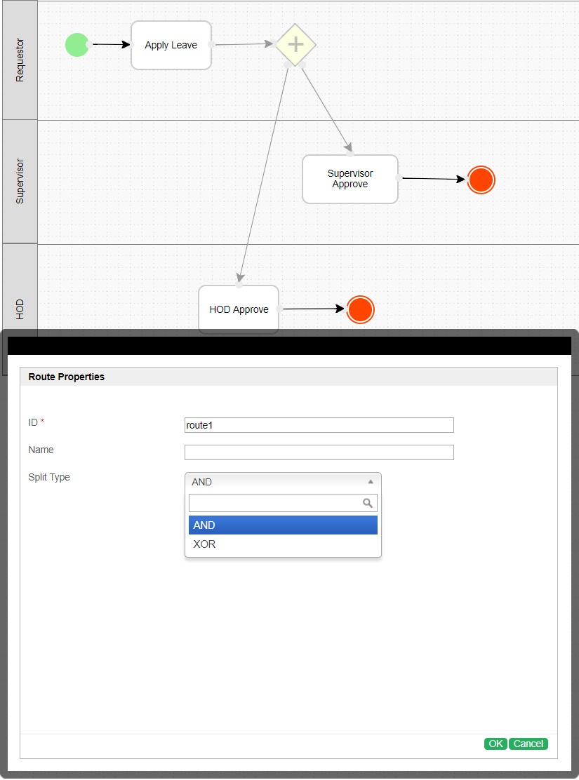 A fork is used when your process needs to split ways concurrently, meaning that your process will be traveling along 2 separate paths (hence, "fork"). For instance, in our given example, once the requester submits his leave application, a notification is sent to both his supervisor and HOD at the same time. If that is the case, we'll need to add a route, set the split type to "and" and our process will look like: