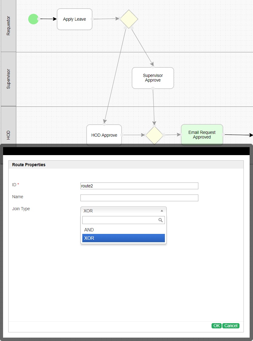 - XOR (or exclusive ORs in geek talk) means that the route is active and considered fulfilled once any of the transitions reaches it. So if you use the XOR option in your join route, the back office will be notified the moment either the supervisor or HOD responds.