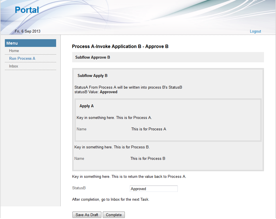 Upon completion of "Approve B" in Process B, Workflow Variable from Process B (statusB) will be returned to Process A (statusA).