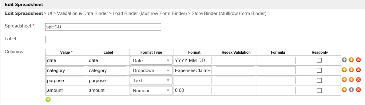 Figure 4 : Spreadsheet Form Element Properties - Validation & Data Binder