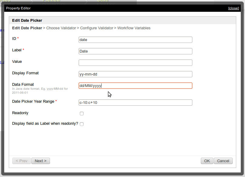 Figure 6: Edit the date picker's properties and set "Data Format" to "dd/MM/yyyy"