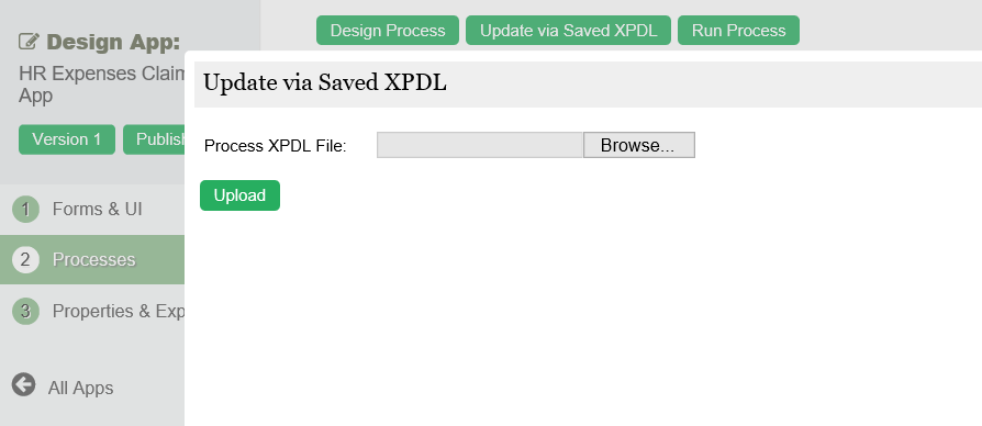The option is available for App Designer to quickly upload the .xpdl file locally to Joget Workflow to update it's process design.