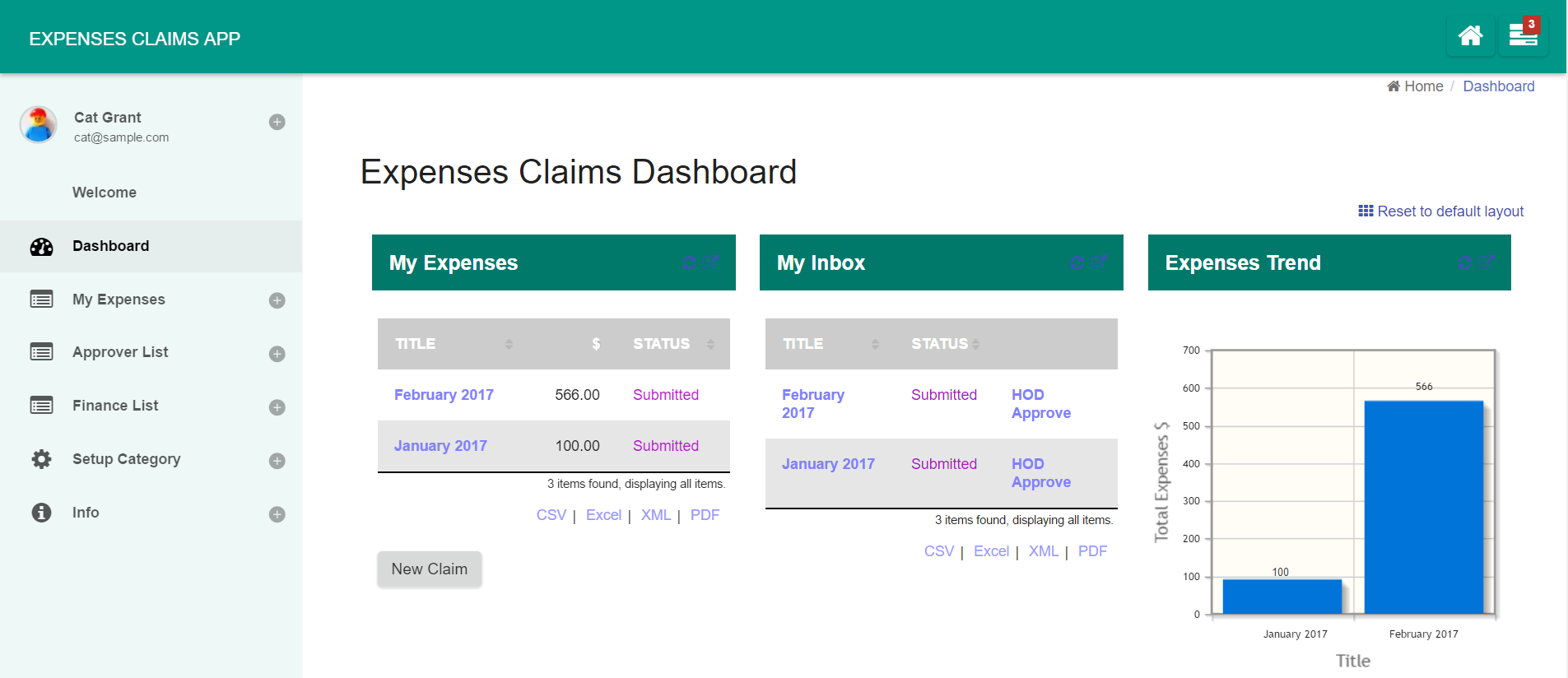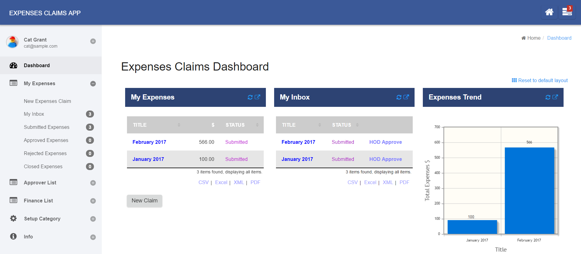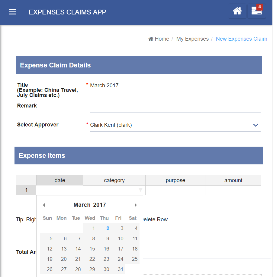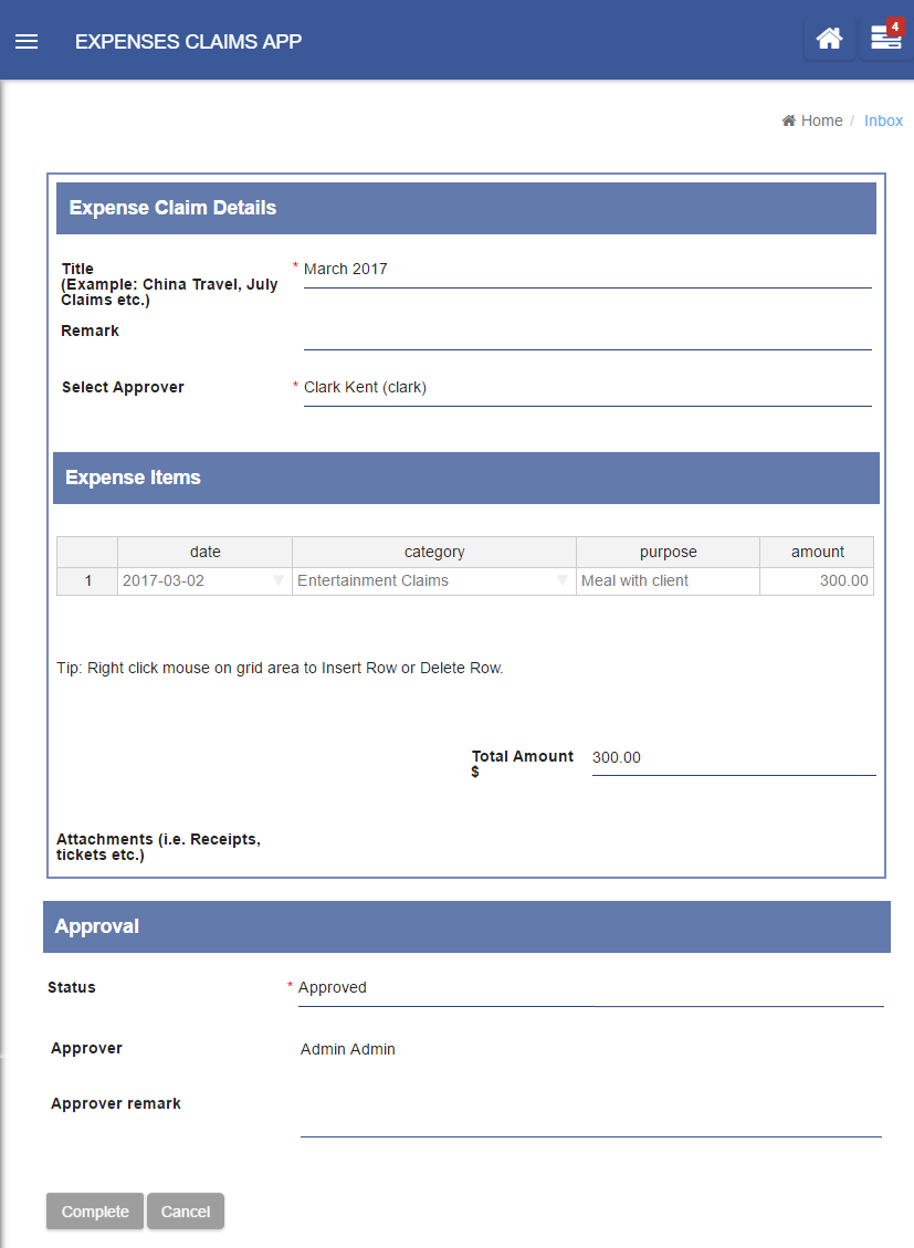 In the sample HR Expenses Claim App, login as a normal employee (Cat) and click on the New Expenses Claim to see an expenses claim form. Fill up the form and click on Complete to submit.