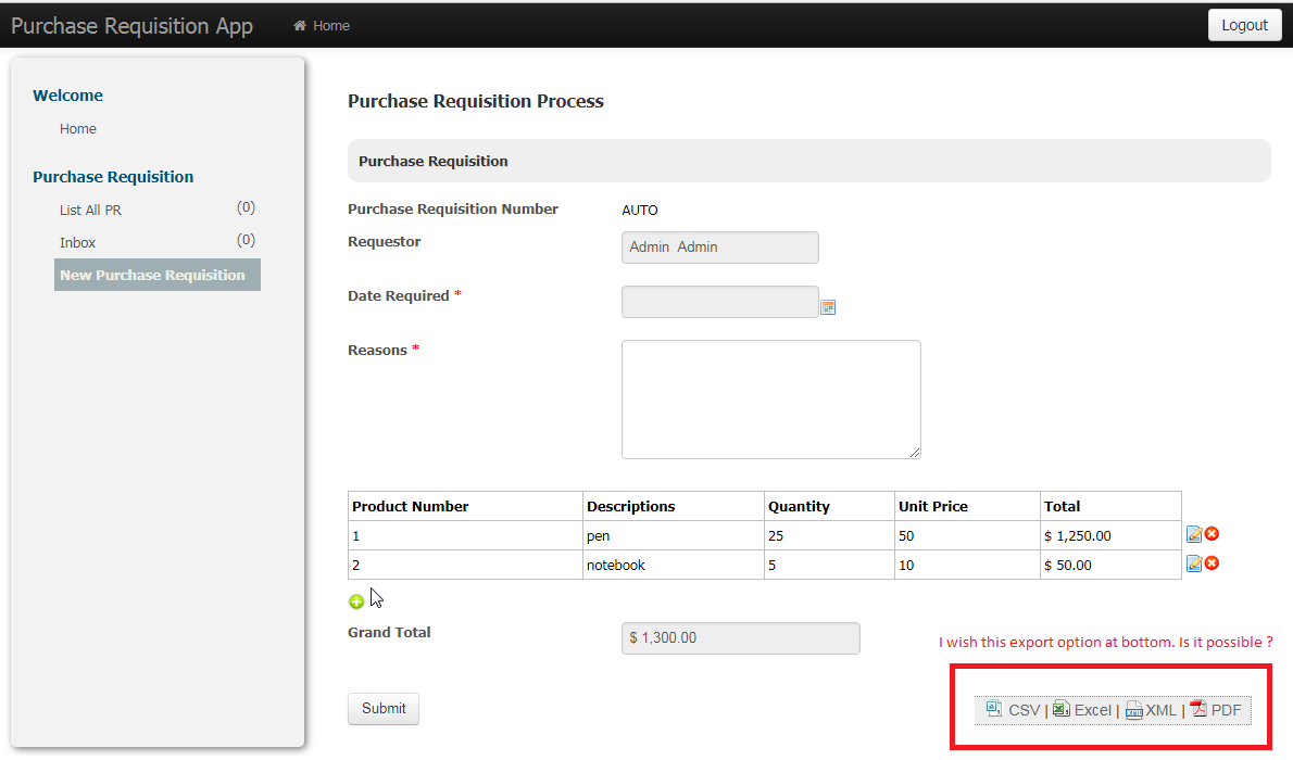 I wish to have the export option in forms where I have a grid with multiple rows. I couldn't see this button.