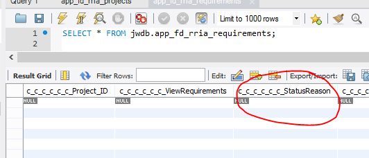 In the picture, there are 6 X "c_" because I saved the form 6 times. I think the behavior does not happen when i use a more restrictive select clause like "Select c_Status from app_fd_tablename".