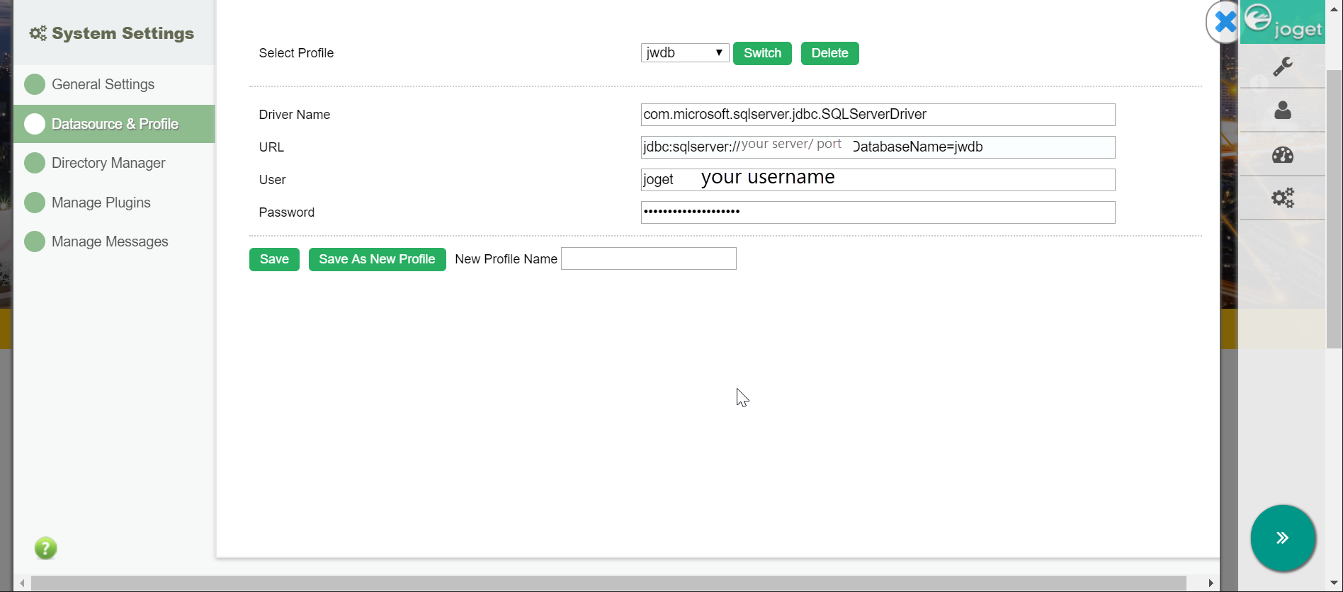Don't forget to make sure that sql server DB must create "jwdb" schema (with empty table is OK) before you setup profile.