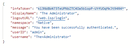 INFO 22 Dec 2019 20:13:53 org.joget.apps.app.lib.JsonTool - {"infaToken":"MDsMndnucJ34ybs6VUlfGbZu8trrhIXcCbSGKKZwERA*","displayName":"The Administrator","logoutURL":"/web.isp/login","namespace":"Native","message":"You have been successfully authenticated.","userID":"admin","username":"The+Administrator"}
