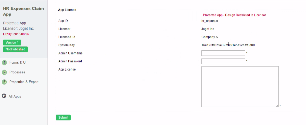 • Key in your administrative credential and the App License key obtained into the form.