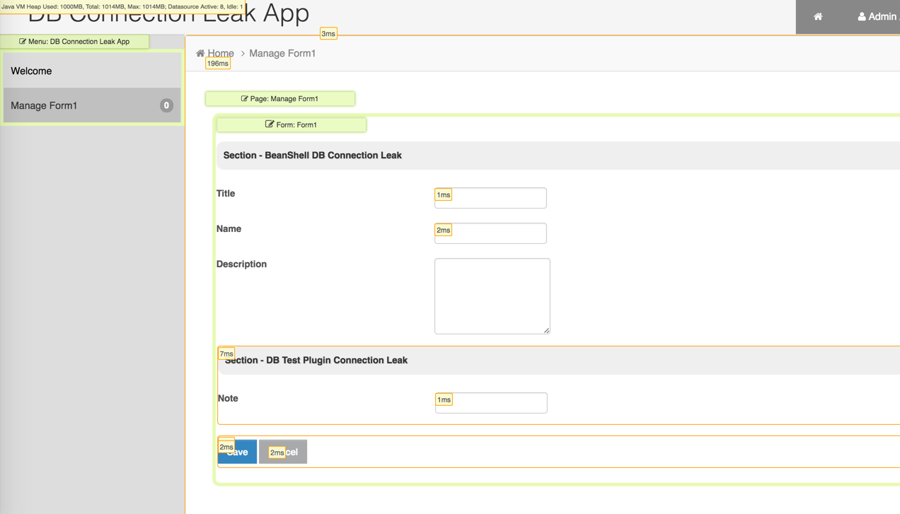 This connection monitoring keeps track of the platform datasource. However, there are also many cases where custom JDBC code in BeanShell scripts or custom plugins do not use the platform datasource, and utilize their own JDBC connections. To cater for this, there is a warning mechanism that checks for potential unclosed JDBC connections that may cause leaks. This detection works for both BeanShell and custom plugin code. When a possible leak is detected, a warning will be captured in the platform log file, e.g.