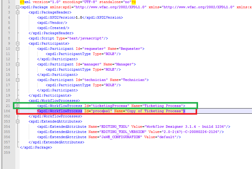 - Create new participant, locate the activities that use the old participant in the XPDL view and do a search and replace in your favourite text editor.