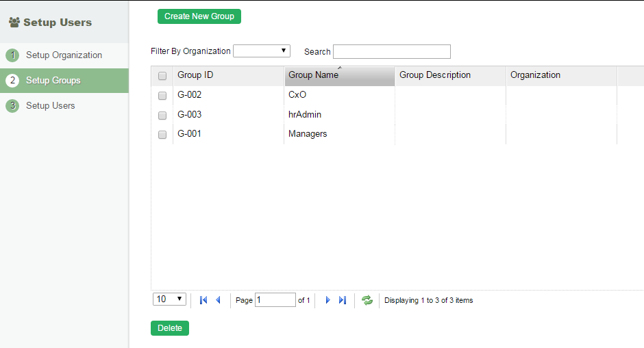 To manage groups, go to Setup Users > Setup Groups. Note that each group created can be tied to a specific organization, although not necessarily so. As mentioned earlier, a user can belong to multiple groups and, unless restricted, a group can have members that span several organizations.