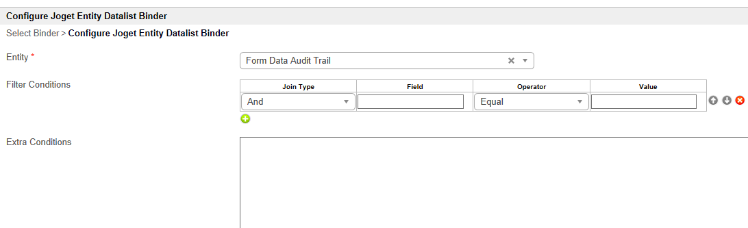 รูปที่ 1: ตัวอย่างดาตาลิสต์ โดยใช้ Joget Entity Data Binder ที่จะดึงข้อมูลจาก Form Data Audit Trail Entity