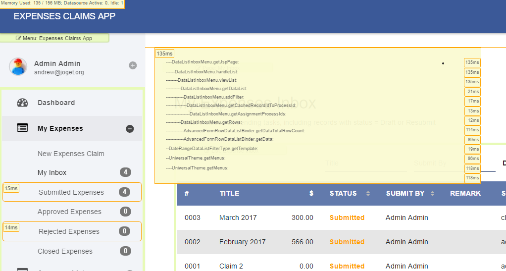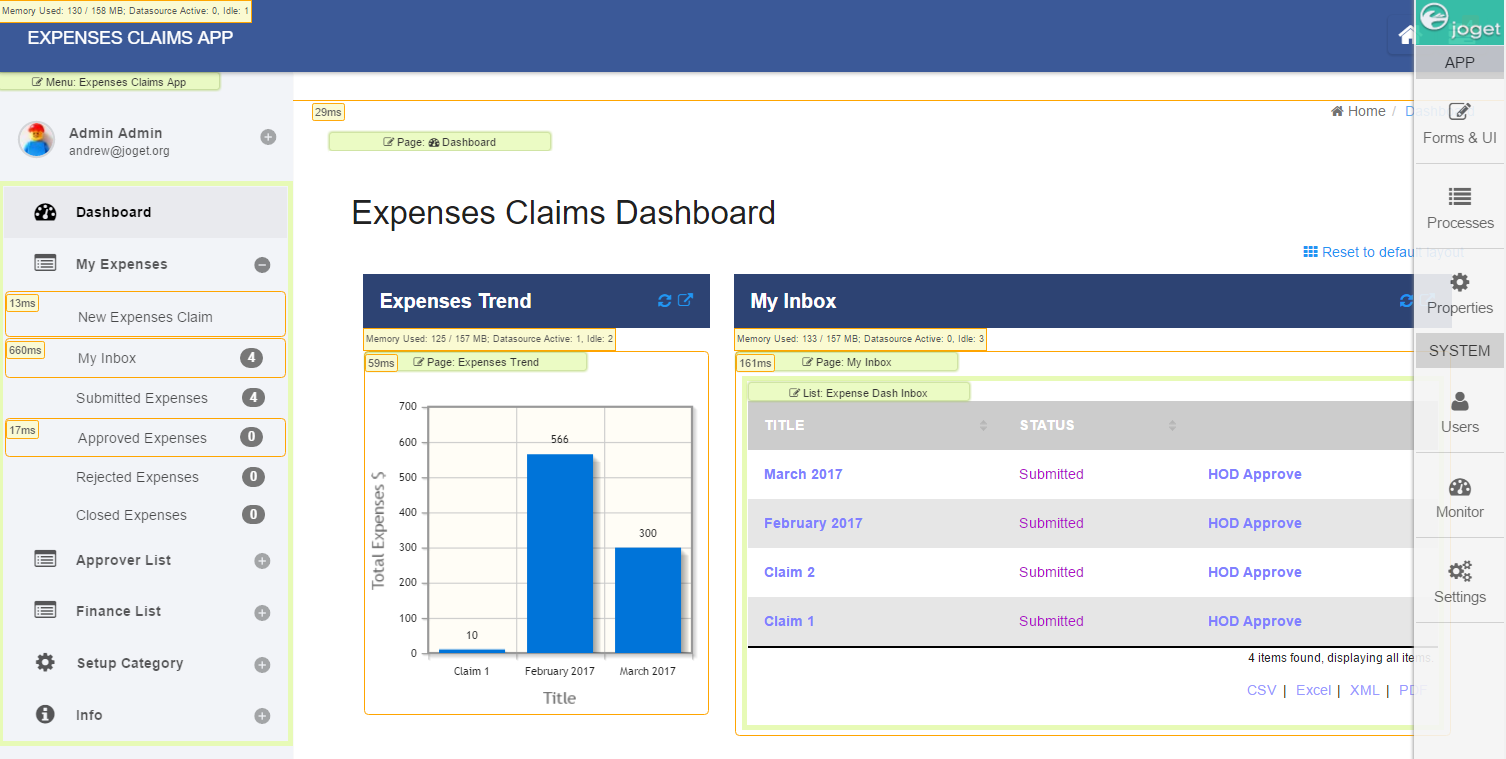 The Performance Analyzer is a new feature first introduced in Joget Workflow v5 Enterprise Edition that allows administrators and app designers to analyze the performance of their apps and to identify possible bottlenecks. In Joget Workflow v6, it has been enhanced further.