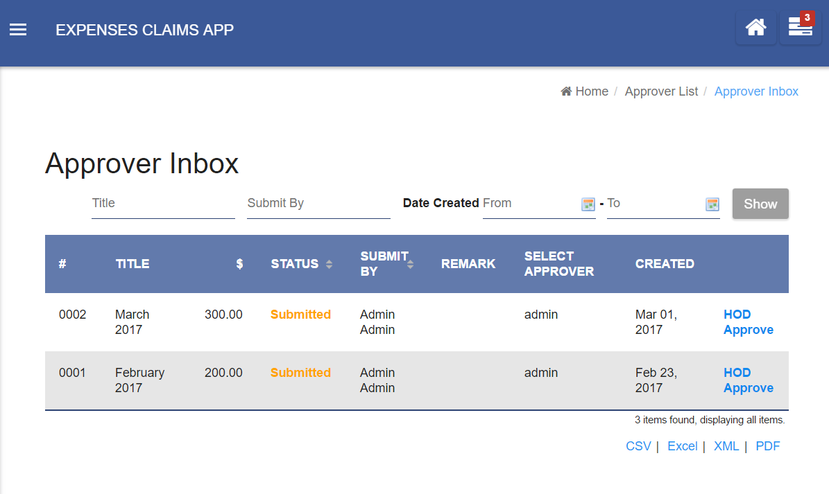 Logout and login as Cat's manager Clark, then click on Approver Inbox in the menu. The page displays a datalist showing the task inbox, in this case Clark will see a pending claim from Cat.