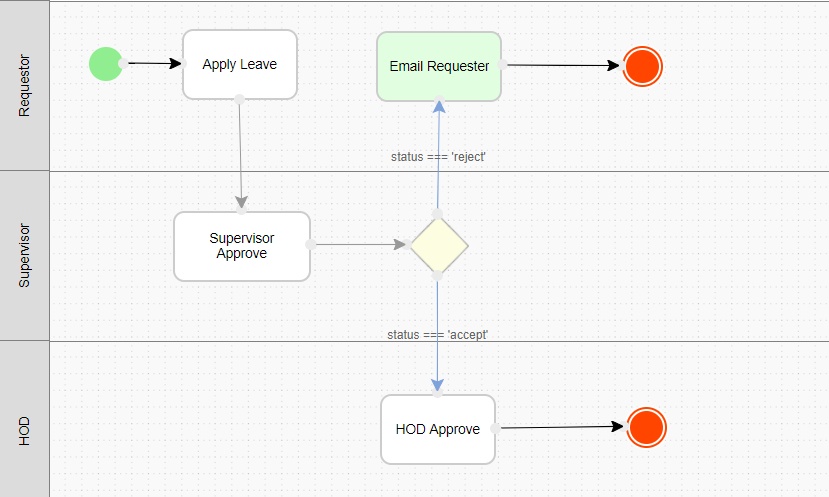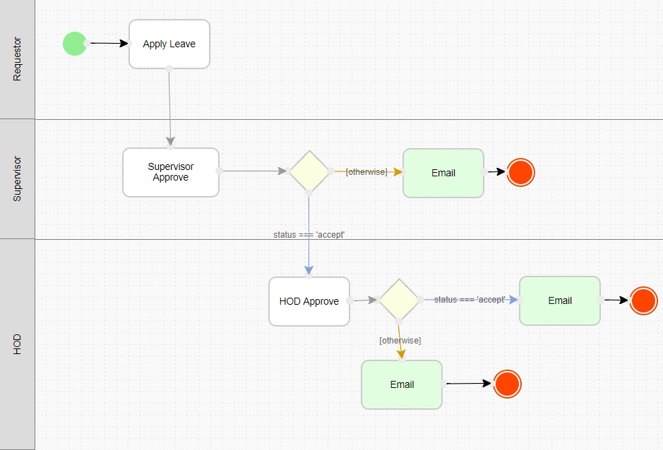 To sum it up, once the requester submits an application, the supervisor will decide on whether to accept or reject. If the supervisor accepts, the application will go to the HOD for approval. Two routes are needed here: one for when the supervisor approves and another for when the HOD approves. Again, while the position of the routes in specific swimlanes doesn't really matter, it is ideal to keep the process legible.