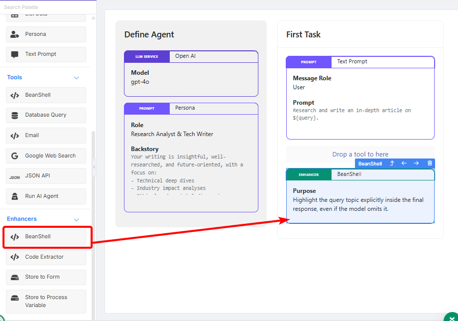 The BeanShell Enhancer allows you to run custom Java code to modify or enhance the final AI response before it is returned to the user. Unlike prompt plugins that influence the input to the AI, Enhancers operate after the AI has generated a response, giving you full control to transform, format, filter, or even enrich the output.