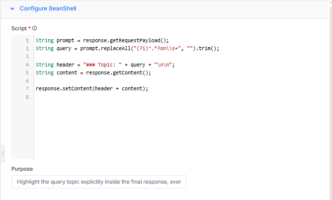Script | Write your Beanshell (Java-like) code here to process the AI response. The response from the AI is usually available in a variable like response or message , depending on your implementation. You can manipulate this and output a new version of the response. |
