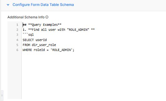 Additional Schema Info | Use this field to add extra context or metadata about your data tables that might not be automatically extracted from the form definitions. This helps the AI better understand relationships, constraints, or business rules that apply to the schema. You can also specify the table data that you want AI to read. |