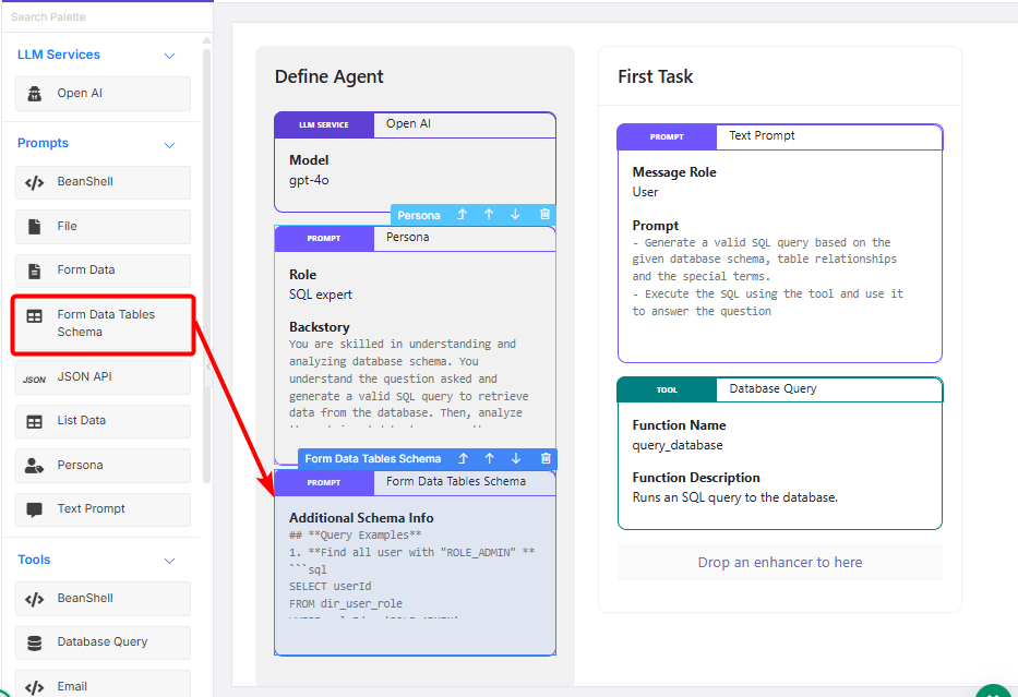 The Form Data Tables Schema element automatically goes through every form created in the application and identifies the database table structure (schema) used by each form. It then generates a description of these schemas that can be used as context for querying data with tools like the Database Query Tool or AI-based SQL generation.