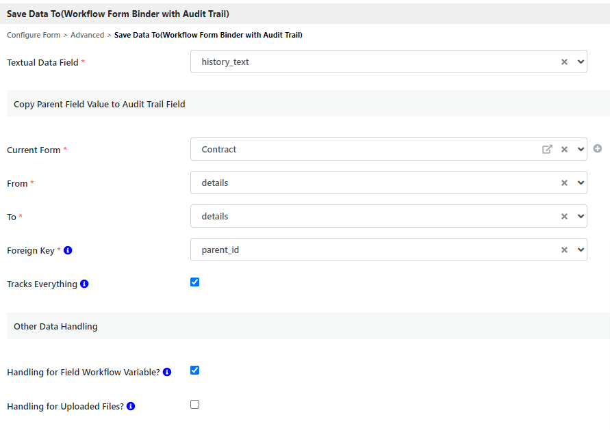 Next, go to Contract Form > Settings > Advanced > Data > Save Data To and choose Workflow Form Binder with Audit Trail.