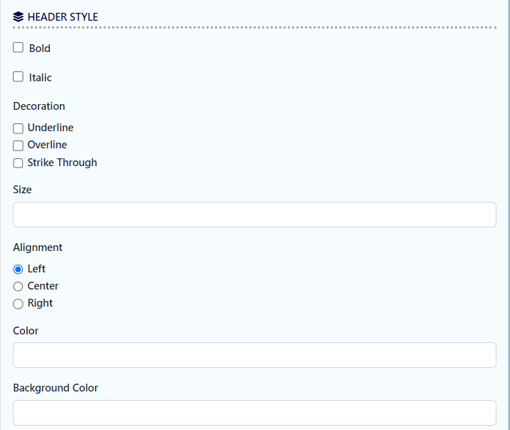 Size | Header text size. Example 30px |