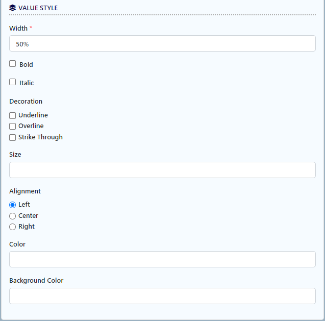 | Margin Bottom | Bottom margin of Label-Value Table. Example 10px or 10% |