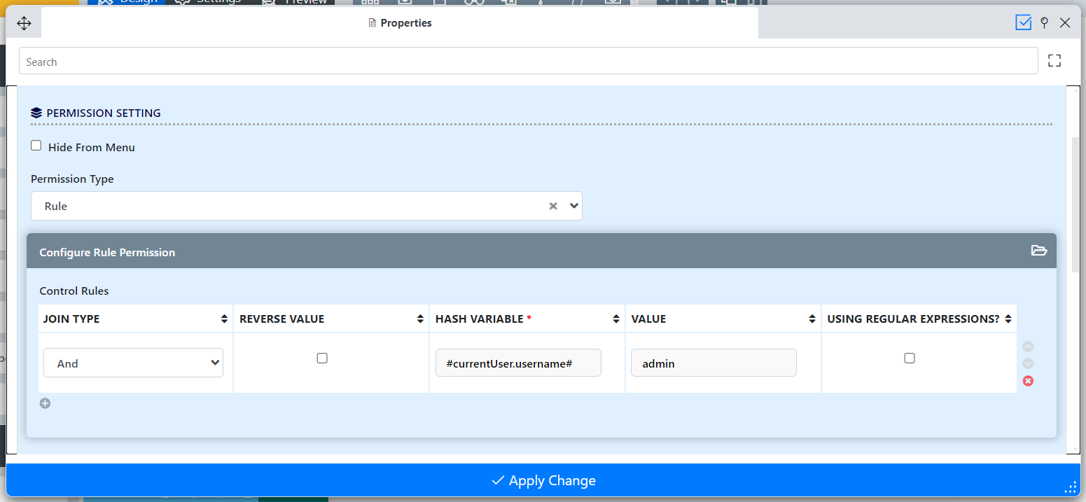 The Rule Permission allows users to control the permission of the menu by checking the values of hash variables.
