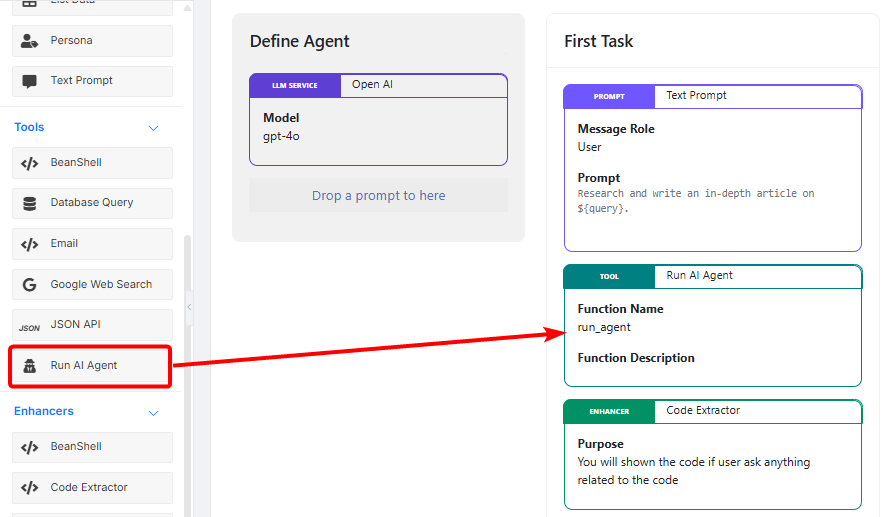 - Locate the Run AI Agent element under the Tools section of the palette.