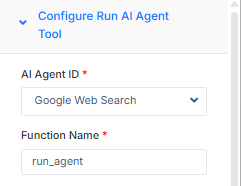 The Run AI Agent tool allows you to invoke another existing AI agent from within a current agent flow. This enables modular and reusable design, where complex tasks can be broken down into smaller, dedicated agents that can be triggered as needed.