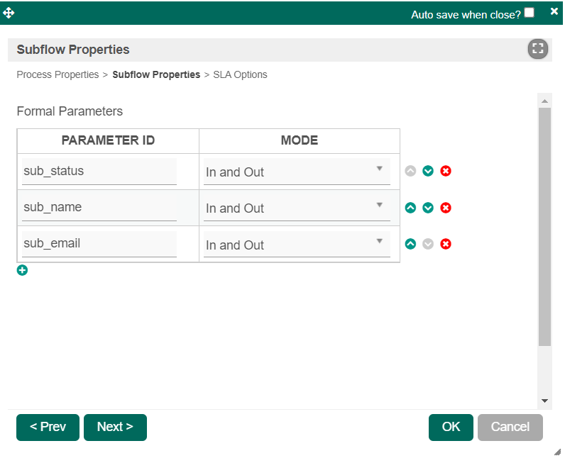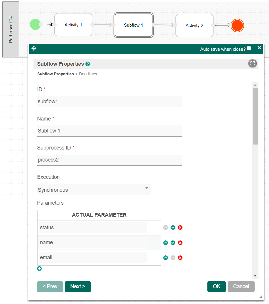 ในตัวอย่างนี้เรามี 2 กระบวนการโดยกระบวนการแรก "กระบวนการทำงาน 1" ที่มี Subflow เรียกกระบวนการที่สอง "กระบวนการทำงาน 2" |