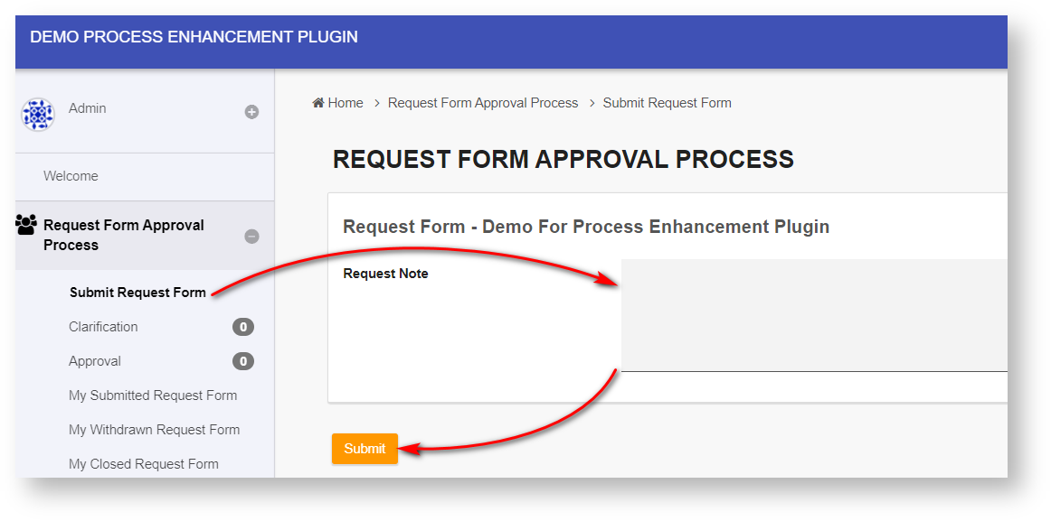 9. In the app, click on the Submit Request Form menu. Fill in the "Request Note" and click on the Submit button (See Figure 3).