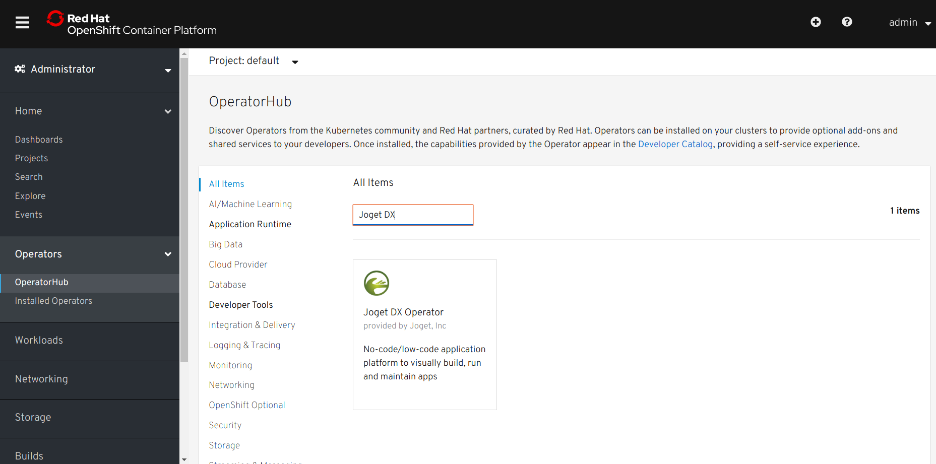 Browse to Catalog > Installed Operators and select Joget DX Operator to confirm that the operator has been installed successfully.