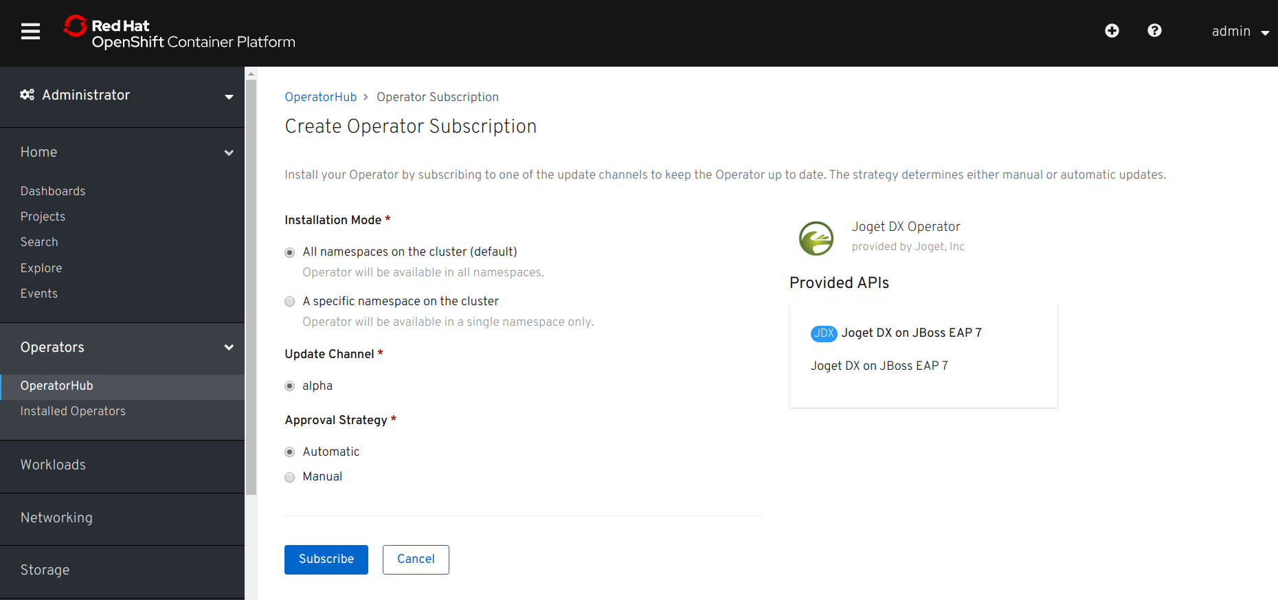 Click on the Subscribe Install button to install the Joget DX Operator.