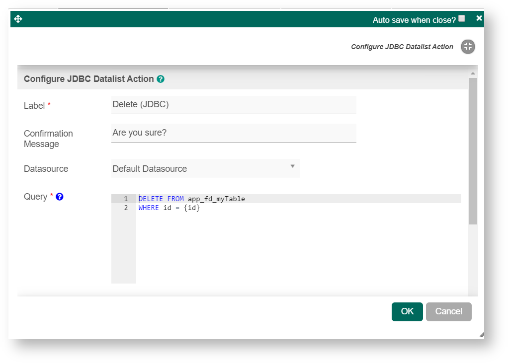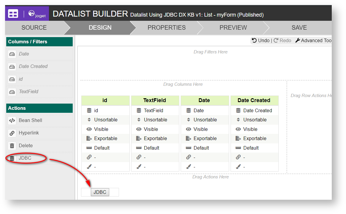 | Label | Datalist button label. | Figure 1 : JDBC Action Menu Figure 2 : JDBC Datalist Action | ||||||||||||||||||||||||||||||||||||