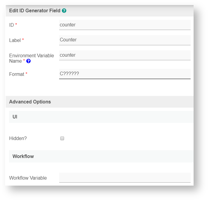 | Environment Variable Name | Name of the environment variable to be used to store the running number. Joget will automatically create the environment variable in Properties & Export if the name does not exist. Only letters (a-z and A-Z), numbers (0-9) and underscore (_) are allowed in the Environment Variable Name field. Do ensure your Environment Variable Names are unique for each form in your app (meaning for each form that is mapped to a different database table name). If you are using the ID Generator Field as "id", meaning it is a primary key value, be careful not to override the environment variable value when inporting apps: do not click the "Show Advanced Options > Override environment variables" checkbox in Import App screen. | |||||